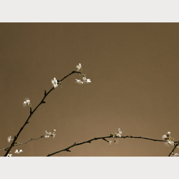 Inspired by the architecture of a cherry blossom branch and a study of abundance vs. scarcity of blooms. The warm coffee toned back drops highlights delicate details in the blossoms themselves.