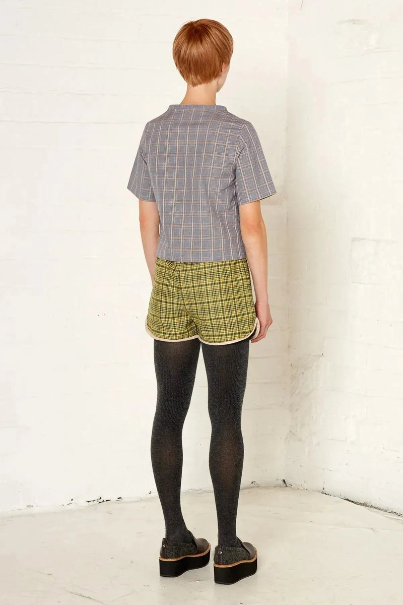 This top is available in two colours: a natural brown check that looks great layered over a pleated skirt of similar neutral tones, and a blue version which is perfect for dressier occasions. Production of both colours will be limited to 30 pieces.