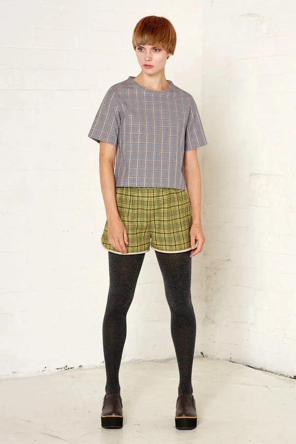 The Brigitte top has a gorgeous, sharp outline, from the shoulders and straight, mid-length sleeves right through to the hemline, and these shapes all show off the beautiful check of the roll end fabric. It is finished with a wide band collar that introduces some softness and creates a flattering neckline.