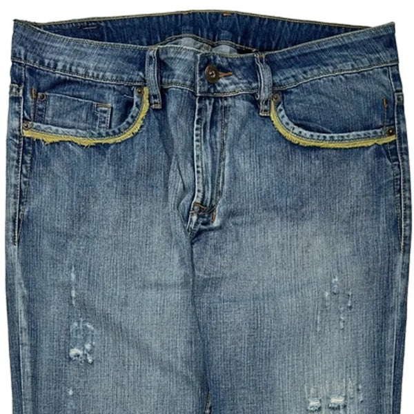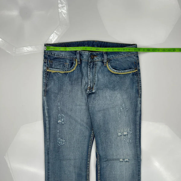 Distressed Jeans With Yellow Stitching On Back Pockets