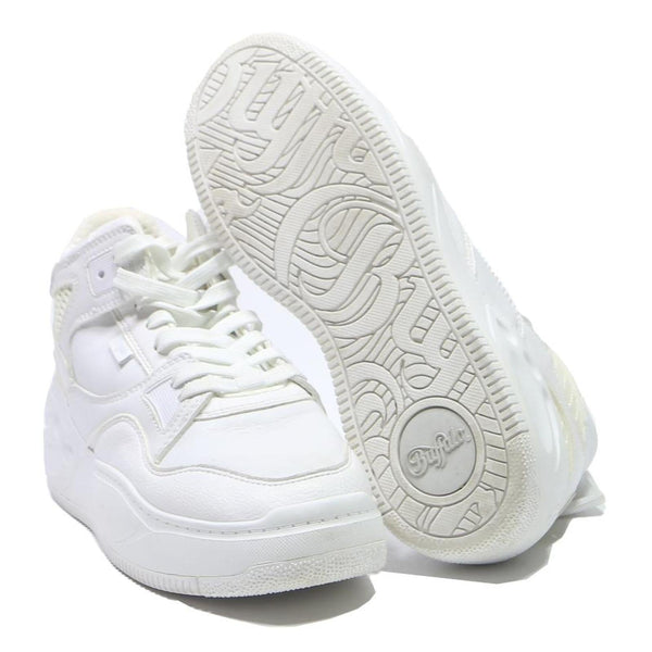 These BUFFALO womens trainers feature a high top design in pure white leather for a sleek and modern look. The platform sole adds significant height and a bold chunky silhouette, complemented by leather panels and mesh accents for visual interest.