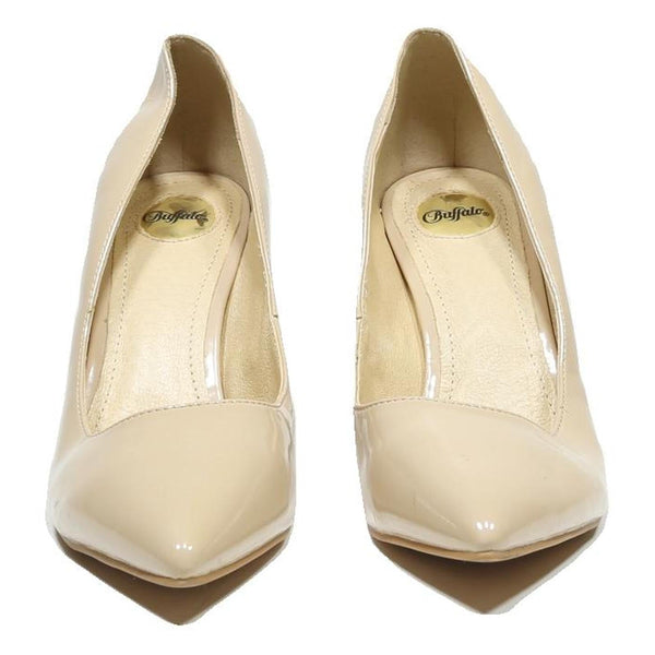 These BUFFALO womens high heels come in a soft beige patent synthetic material, offering a sleek and polished look. The shoes feature a pointed toe and a slender heel that adds a touch of elegance and sophistication to any outfit. The glossy finish of the synthetic patent gives a stylish shine suitable for formal occasions or professional settings.