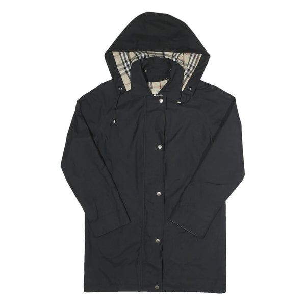 This womens BURBERRY jacket presents a sleek black exterior with a hood featuring the iconic Burberry check pattern lining, adding a subtle classic brand accent. The front closes with a zip and secure snap buttons, blending function and style effortlessly.