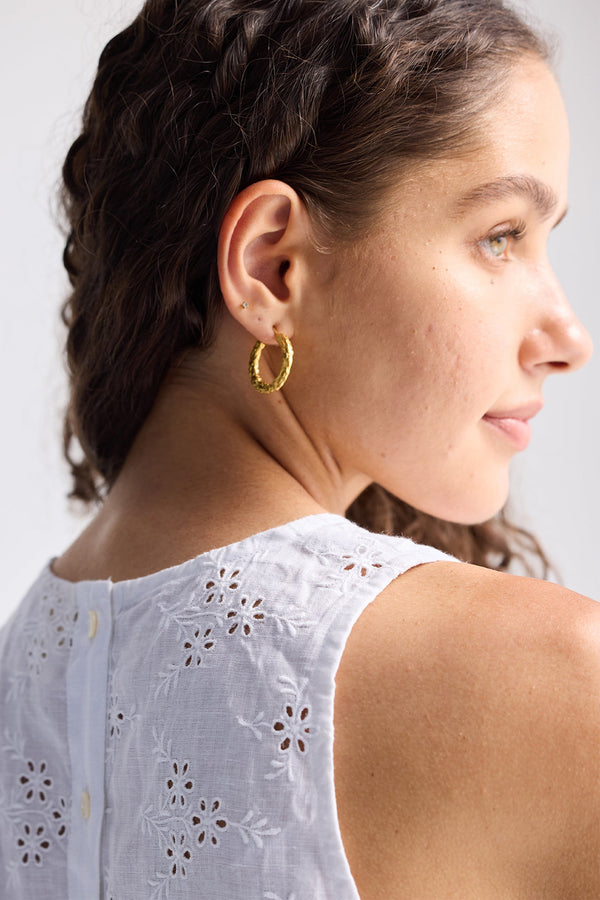 Make your exit as captivating as your entrance! This sleeveless top surprises with an eyelet embroidered back, delicate shell buttons, and a sophisticated plain front.