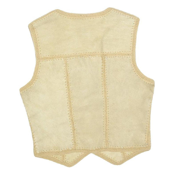 This C&A womens waistcoat features a soft beige colour with a suede effect finish. It has a V-neck and is buttoned down the front with matching fabric buttons. The waistcoat is sleeveless with decorative stitching along the edges and seams, enhancing its tailored look.