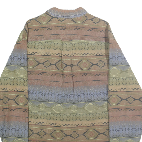 This womens CABELA'S shirt features an all-over pattern in soft beige, brown, green, and muted blue tones, creating an earthy and natural aesthetic. The intricate geometric and tribal inspired print extends across the entire shirt, including the collar and cuffs, giving it a unique and distinctive look. The shirt has a traditional button-down front and long sleeves with buttoned cuffs.