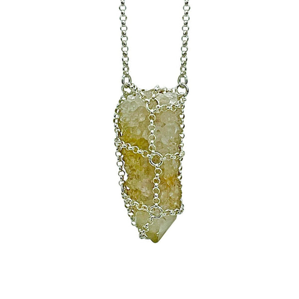 The Caged Citrine Quartz Pendant is a statement of craftsmanship, this necklace is made of solid 925 sterling silver and a one-of-a-kind cactus quartz full of crystals.