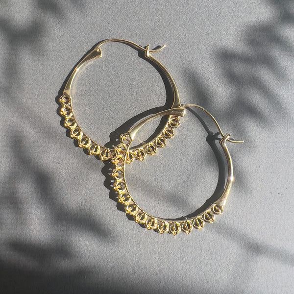 Cast from recycled brass, these hoops embrace our commitment to environmental consciousness. Each pair is meticulously plated with a heavy 18k gold finish, ensuring a timeless allure that lasts.