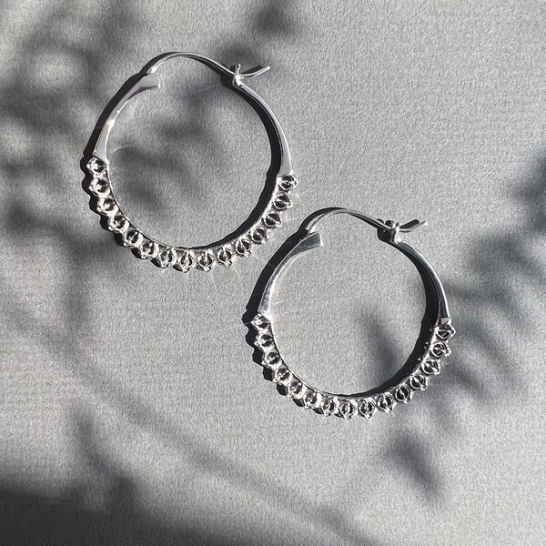 Cast from recycled brass, these hoops embrace our commitment to environmental consciousness. Each pair is meticulously plated with a heavy and hypoallergenic rhodium finish, ensuring a timeless allure that lasts.