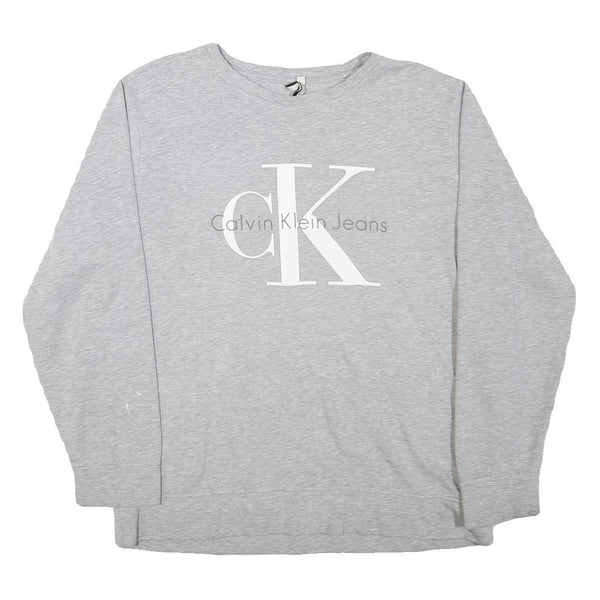 This mens Calvin Klein Jeans sweatshirt features a light grey colour with a large white and grey CK logo printed prominently on the front alongside the text 'Calvin Klein Jeans'. The design is simple yet instantly recognisable, embodying the brand's classic aesthetic.