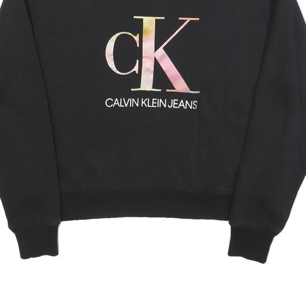 This Calvin Klein Jeans sweatshirt features a classic black colour with a large front logo print displaying the iconic 'cK' letters in a subtle pastel gradient above the brand name in white. The sweatshirt has a crew neck and long sleeves with ribbed cuffs and hem for a comfortable fit. The back of the sweatshirt is plain black with a small embroidered 'cK' logo near the hem on the sleeve.
