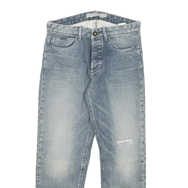 These womens Calvin Klein Jeans feature a timeless light wash denim with subtle distressing on the right thigh for a casual, worn-in look. The jeans showcase a classic five-pocket design with a button closure and belt loops. The fabric has a soft cotton blend feel, ensuring comfortable wear throughout the day.