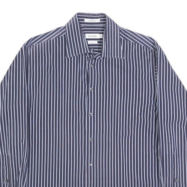 This men's Calvin Klein shirt showcases a classic striped pattern in blue and white with vertical lines that create a slimming effect. It features a traditional pointed collar and a full button front closure. The fabric is 100% cotton, providing a soft and breathable feel ideal for everyday wear.