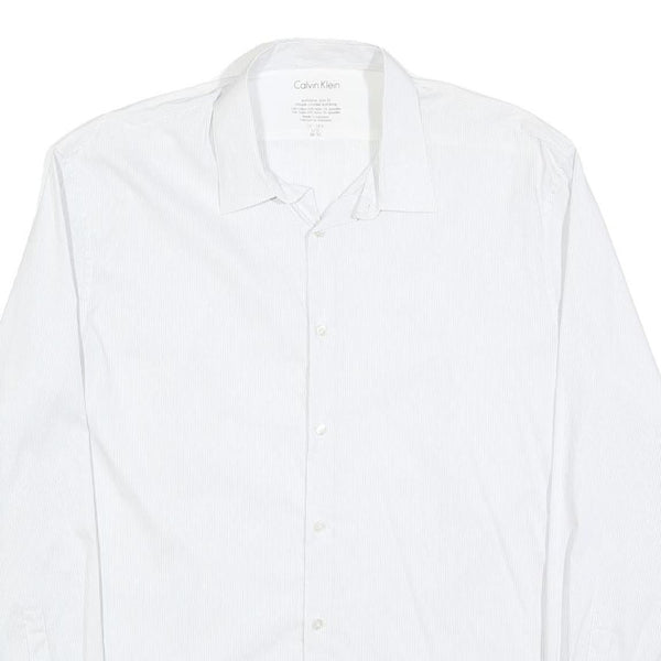 This Calvin Klein mens shirt is crafted in a soft cotton blend in a clean white colour, featuring a subtle, fine pinstripe texture visible upon close inspection. It has a classic button-down front with a traditional point collar and long sleeves finished with button cuffs. The shirt showcases minimalist branding with "Calvin Klein" printed inside the collar area.