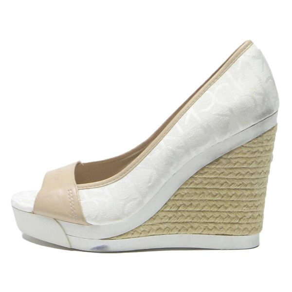 These Calvin Klein womens wedge sandals feature a white synthetic upper with a subtle embossed CK logo pattern and a beige peep toe cap, creating a stylish two-tone look. The sandals have a high wedge heel with a woven texture, giving a summery and elegant feel.