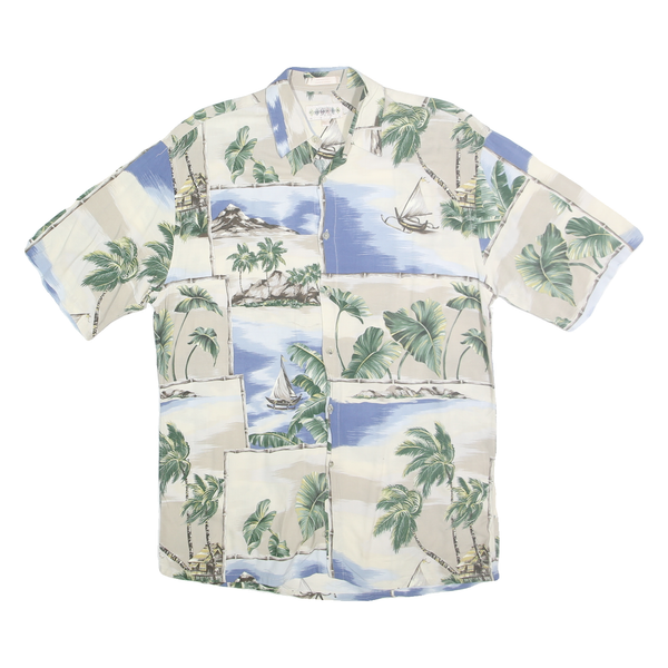 CAMPIA MODA Mens Beige & Blue Rayon Hawaiian Shirt L Tropical Beach Print Summer
