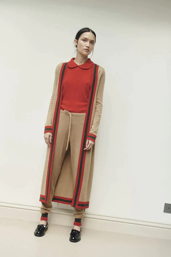 A fabulous long camel cardigan in the warmest, winter friendly tones with a smart contrast edge and subtle, wide rib knit woven in our super soft, pure cashmere.