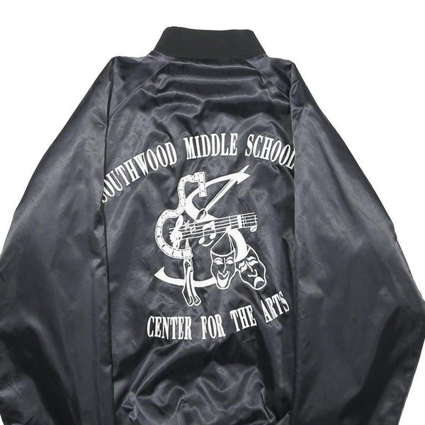 The back prominently displays "Southwood Middle School Centre for the Arts" surrounding a white graphic that combines musical and theatrical symbols, highlighting an artistic theme. The jacket has a button closure, ribbed cuffs, and a fitted waistband. The classic bomber-style collar adds to its retro sporty appeal for an everyday statement piece.