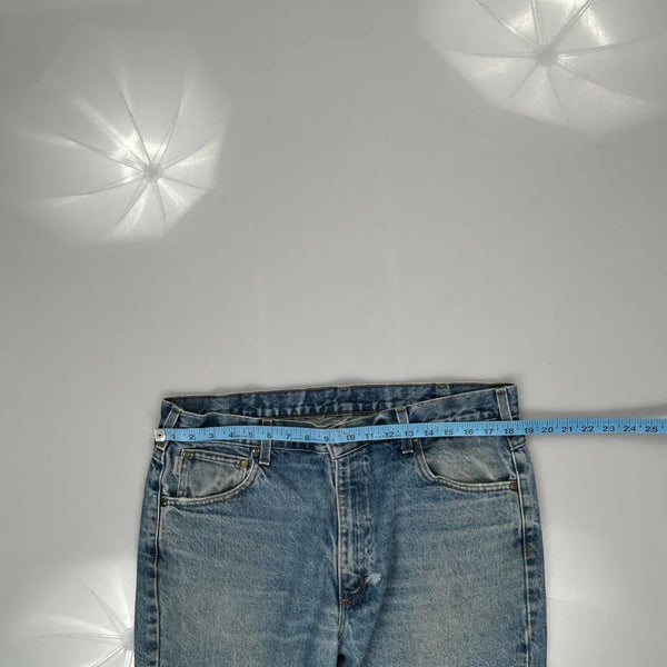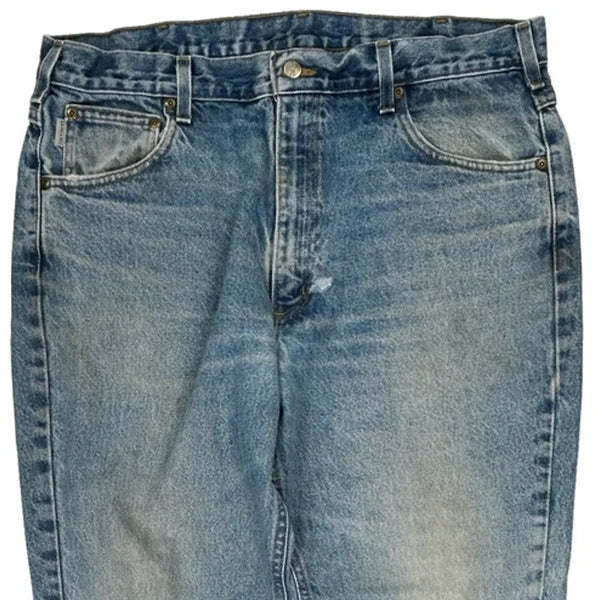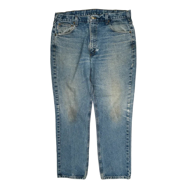 Light Wash Carhartt Jeans With Minor Wear Marks.