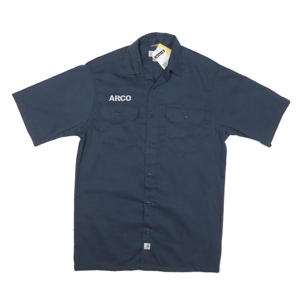 This Carhartt mens shirt features a deep blue colour with short sleeves and a classic pointed collar. The front includes two buttoned flap chest pockets and embroidered text 'ARCO' on the left chest for a workwear aesthetic. It is finished with Carhartt branding on a small label at the hem.