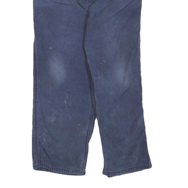 These CARHARTT mens trousers feature a deep blue colour characteristic of workwear style, with visible fading and light wear marks indicative of pre-loved use. The fabric is a durable cotton blend, providing a sturdy yet comfortable feel suitable for everyday wear. The trousers include classic five-pocket styling and a zip closure for practicality.