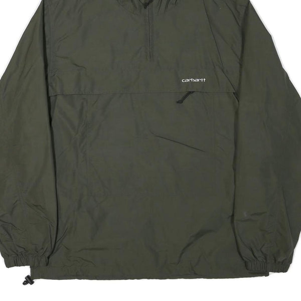 This mens Carhartt jacket features a solid green colour crafted from a durable polyester blend, offering a sleek and minimalistic appearance. It includes a hood with adjustable cord drawstrings and a front half-zip closure for easy wear and ventilation. The elasticated cuffs and adjustable hem provide a comfortable fit and help keep out the elements. The Carhartt logo is embroidered in white on the chest, giving it a subtle branded touch.