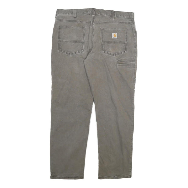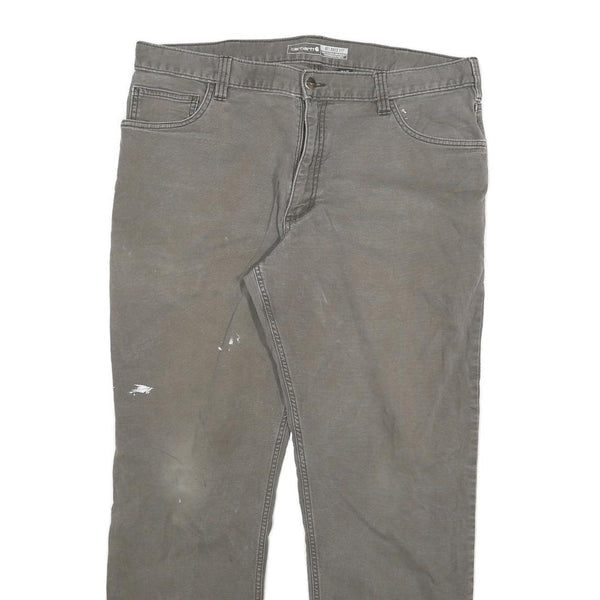 These Mens Carhartt jeans in brown feature a relaxed straight-leg fit crafted from durable cotton blend denim. The design includes classic five-pocket styling along with a practical utility pocket on the side, reinforced stitching, and a zip closure for convenience. The fabric offers a sturdy yet comfortable feel ideal for everyday wear or manual work.