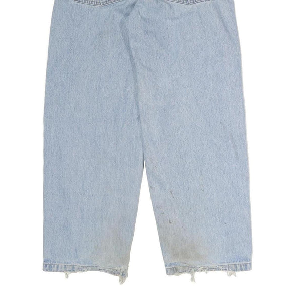 These Carhartt men's jeans feature a light blue denim colour crafted from durable cotton. The fabric has a classic denim texture with some natural wear visible throughout, including faint marks and frayed hems, consistent with fair pre-loved condition. They provide a timeless casual look with visible Carhartt branding on the back pocket.