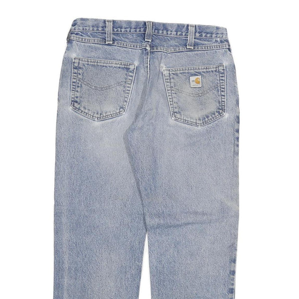 These mens Carhartt jeans feature a light blue denim fabric with a faded, distressed effect on the front left leg. The jeans have classic five-pocket styling and a zip closure. Carhartt branding is visible on a patch above the right back pocket. The cotton blend material provides durability and comfort.