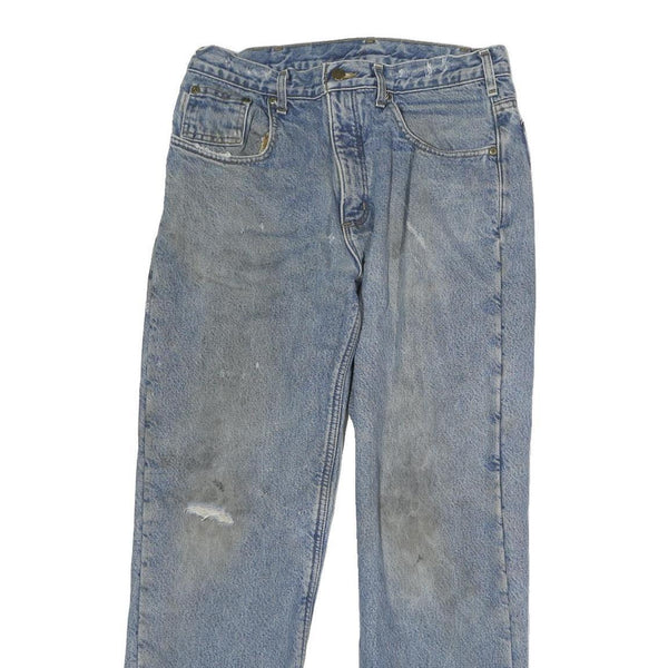 These Carhartt jeans for men feature a classic straight-leg cut in a medium blue denim. The denim shows visible wear with small tears and paint marks that contribute to a vintage, workwear aesthetic. The jeans have a traditional five-pocket style with a zip closure and belt loops.