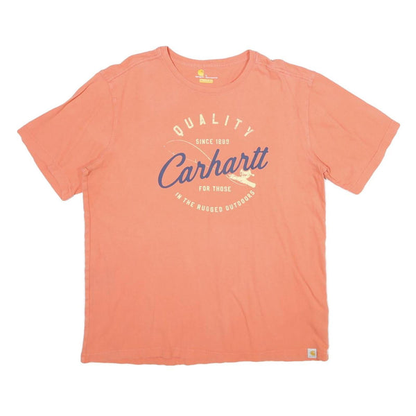 This Carhartt womens T-shirt features a faded orange cotton fabric with a central graphic print that reads "Quality Since 1889 Carhartt For Those In The Rugged Outdoors" in cream and navy fonts. The print includes an illustration of a duck and fishing line detail, reinforcing its outdoor-inspired theme. The crew neck and short sleeves provide a classic casual look.