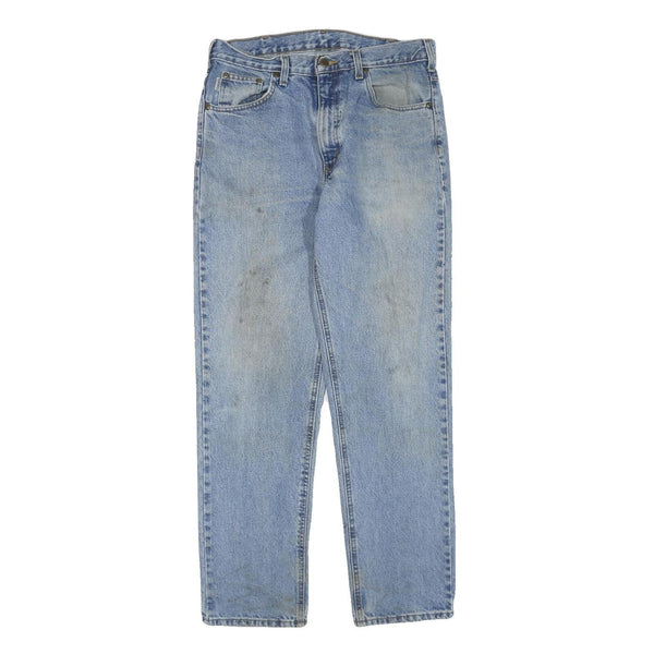 The jeans have a regular fit with a straight leg cut, designed to offer a timeless silhouette. They are full length with a light wash, showing some signs of wear and minor markings but remain in good overall condition. The right back pocket has a small square stitched detail signature to Carhartt's style.