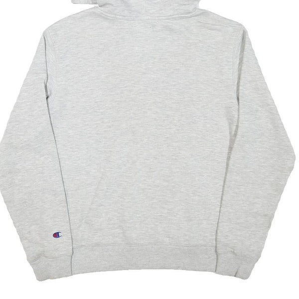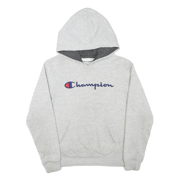 This boys hoodie from Champion features a light grey colour with a contrasting darker grey inner hood. The front prominently displays the Champion brand name in blue with the red and blue 'C' logo embroidered, creating a sporty and recognisable design. The back is plain grey with no additional graphics.