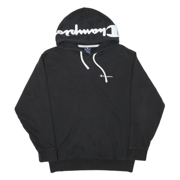 This Champion mens hoodie presents a sleek black colour featuring a bold white 'Champion' logo printed prominently across the hood, alongside a smaller embroidered Champion script on the chest. It has white drawstrings and a classic kangaroo pocket on the front. The overall design offers a sporty yet casual look with brand-focused detailing.
