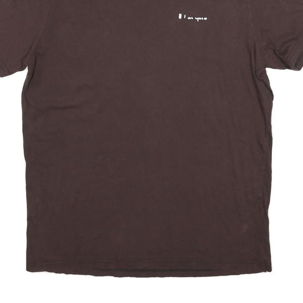 This Champion mens T-shirt features a solid brown colour with a small white graphic text on the left chest and the iconic Champion logo embroidered on the left sleeve. The T-shirt has a classic crew neck design and short sleeves, making it perfect for casual wear.