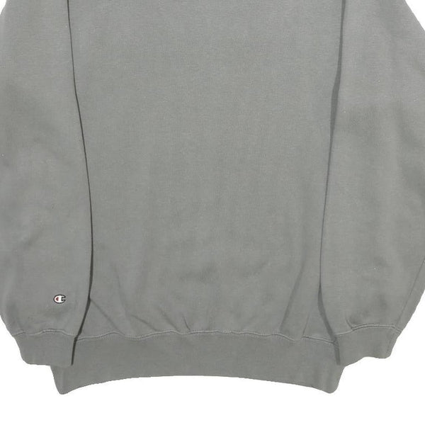 This Champion mens sweatshirt features a muted grey colour with a large Champion logo embroidered across the chest in black and white stitching. The fabric is a comfortable cotton blend with a soft, smooth feel that offers warmth and breathability. It has a classic crew neck neckline and long sleeves with ribbed cuffs, hem, and neckline for a secure fit.
