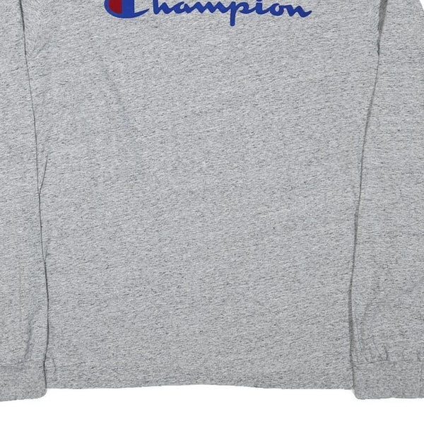 This men's Champion T-shirt features a heather grey colour with the iconic Champion logo scripted in blue with a red and blue emblem centrally placed on the chest. It has long sleeves with ribbed cuffs and a classic crew neck collar for a comfortable fit. The small Champion emblem is also embroidered near the cuff on the left sleeve, adding subtle branding.