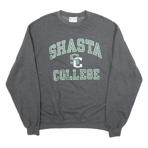 This Champion mens sweatshirt features a classic grey colour with Shasta College printed in large green and white collegiate-style lettering across the chest. The front graphic includes a distinctive "SC" emblem in green and white at the centre. The back is plain grey providing a clean, timeless look.
