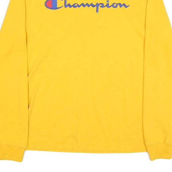 This vibrant yellow long sleeve T-shirt from Champion features the brand's iconic logo prominently across the chest in blue and red. The rear is plain yellow, adding to its clean and classic look. There is also a small Champion logo badge on the sleeve cuff for added branding detail.