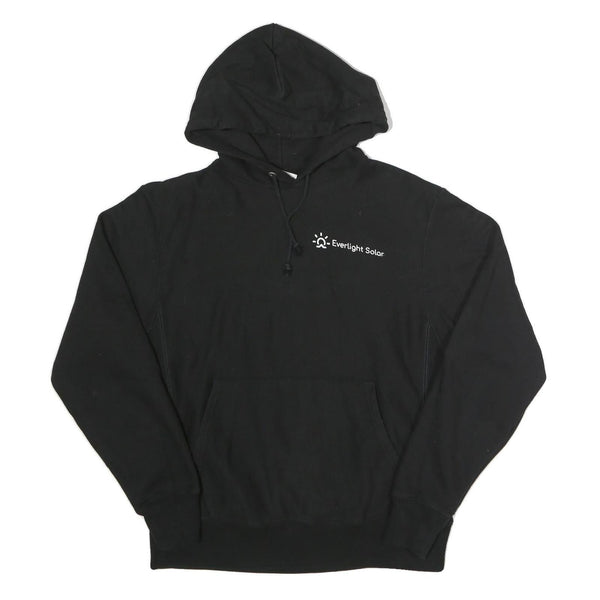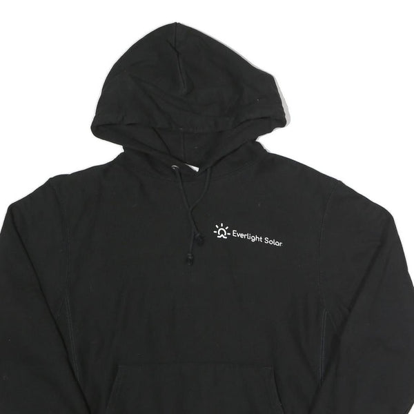 This Champion Reverse Weave hoodie comes in solid black with white Everlight Solar branding printed on the left chest and prominently on the back. The front features a small sun-inspired graphic above the Everlight Solar text, while the back has a larger matching logo and text, creating a distinctive yet clean look. A subtle Champion logo patch is stitched on the left sleeve cuff, confirming authenticity.