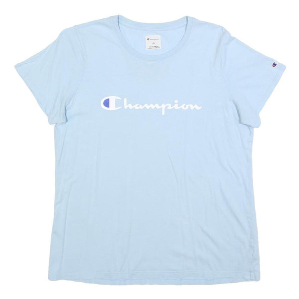 This womens Champion T-Shirt is crafted from a soft cotton blend fabric in a light blue shade. It features the classic Champion text logo printed across the chest in white with a blue 'C' emblem, giving a sporty yet stylish look. The small Champion emblem is also embroidered on the left sleeve for authentic branding.