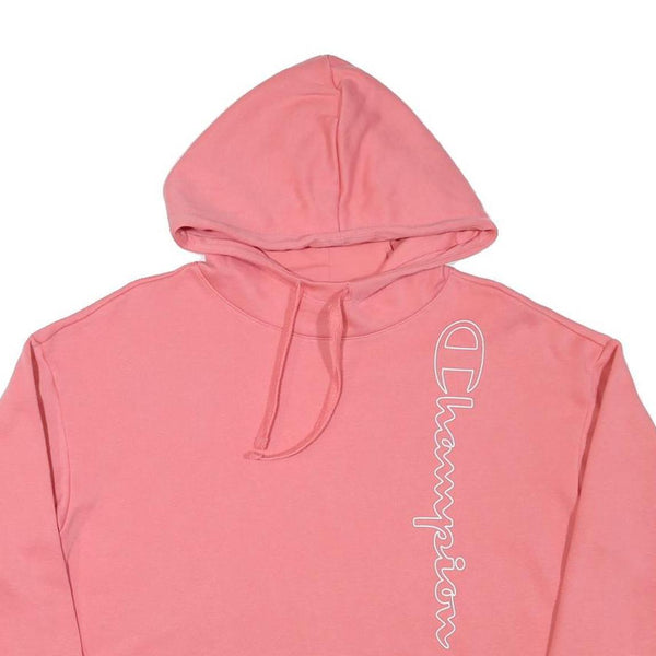This womens Champion hoodie is a soft pink shade crafted from a comfortable cotton blend material, offering a cosy yet breathable feel. It features a pullover style with a drawstring hood and long sleeves, designed for relaxed casual wear.