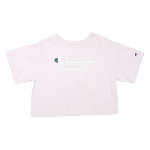 This Champion womens t-shirt features a soft pink colour with a front graphic logo print in white and dark grey, reading "Champion Knitwear Co. Rochester, N.Y.". The fabric is a comfortable cotton blend offering a gentle feel suitable for casual wear. The cropped fit and short sleeves provide a relaxed, modern look, complemented by a classic crew neckline.