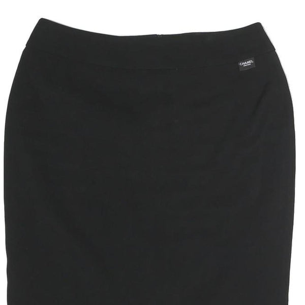 This CHANEL womens skirt is crafted from black cotton for a comfortable and classic appearance. It features a sleek, minimalistic design with a subtle CHANEL logo badge on the waistband, showcasing understated luxury.