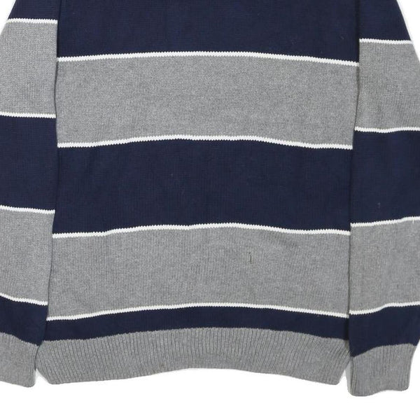 This CHAPS mens jumper features wide horizontal stripes in grey and navy blue, with thin white accents dividing the stripes. The cotton blend material offers a soft and comfortable feel, suitable for casual wear. It has a classic crew neck and ribbed hems at the cuffs and waist, providing a secure yet relaxed fit.