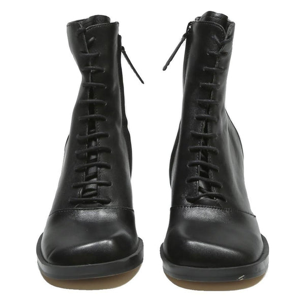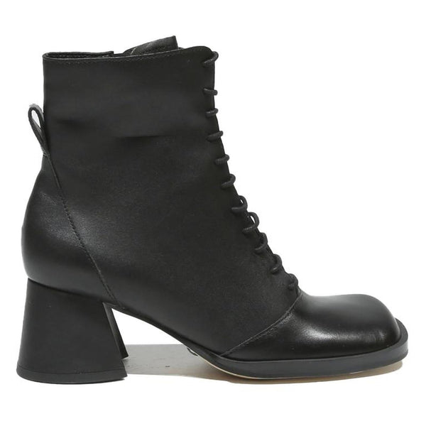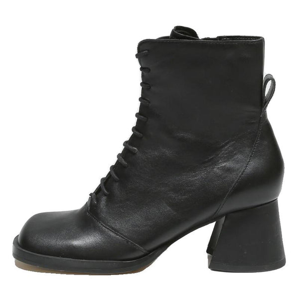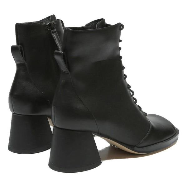 These CHARLES & KEITH women's ankle boots are crafted from smooth black leather, offering a sleek and timeless appearance. The boots feature a lace-up front that adds a refined yet modern twist to classic styling, perfect for both casual and smarter occasions.