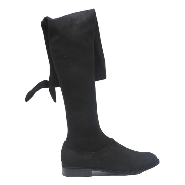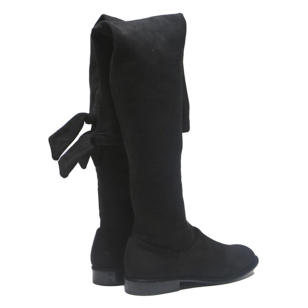 These CHARLES & KEITH womens boots feature a sleek black synthetic material with a smooth finish. The boots have a high, over the knee design with a subtle tie detail at the back, adding a chic finish to the silhouette. The soles are flat with a small heel, offering comfortable wear for extended periods.