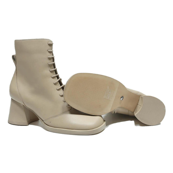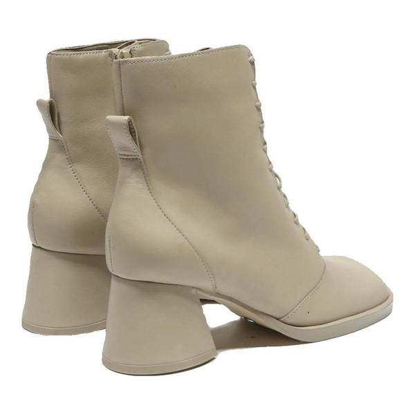 These CHARLES & KEITH womens lace-up ankle boots feature a smooth beige leather exterior with a modern, squared toe and a distinctive, flared block heel for added style and support. The lace-up front with tonal laces adds an elegant touch while allowing a secure fit.