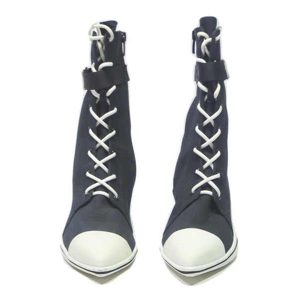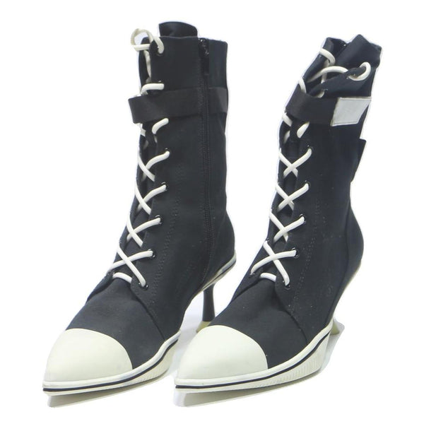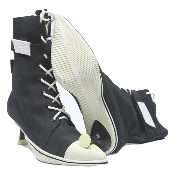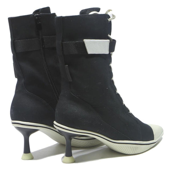 Crafted from durable canvas material, these boots offer a comfortable fit with a pointed toe and a uniquely shaped kitten heel providing elegance and lift. The boots reach just above the ankle and fasten with laces for an adjustable, secure fit. Ideal for adding a fashionable edge to casual or dressier outfits.