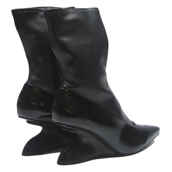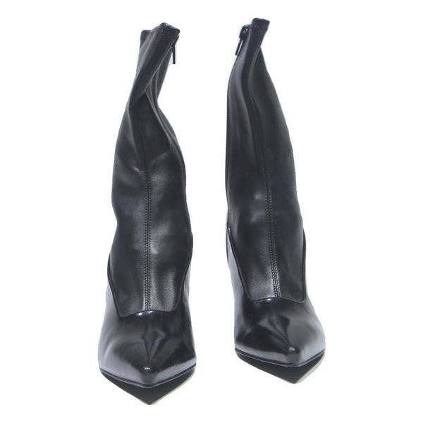 These CHARLES & KEITH ankle boots feature a sleek black leather construction with a smooth, glossy finish on the heel area. The boots have a pointed toe and a distinctive sculpted heel, adding a modern and stylish edge to the design. The upper part is in soft leather, providing a refined yet comfortable fit.